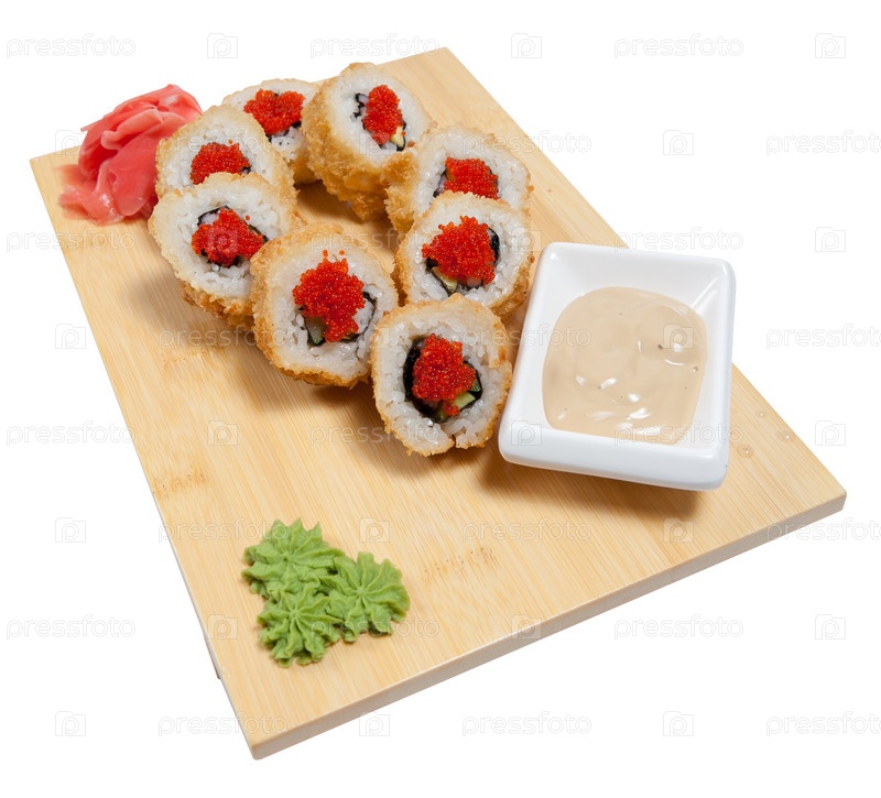 Суши с соусом на белом фоне
