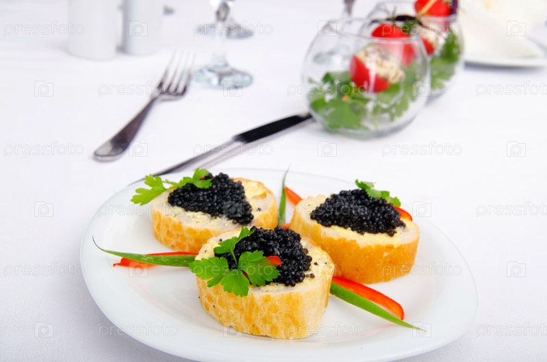 Канапе с черной икрой в тарелке на столе