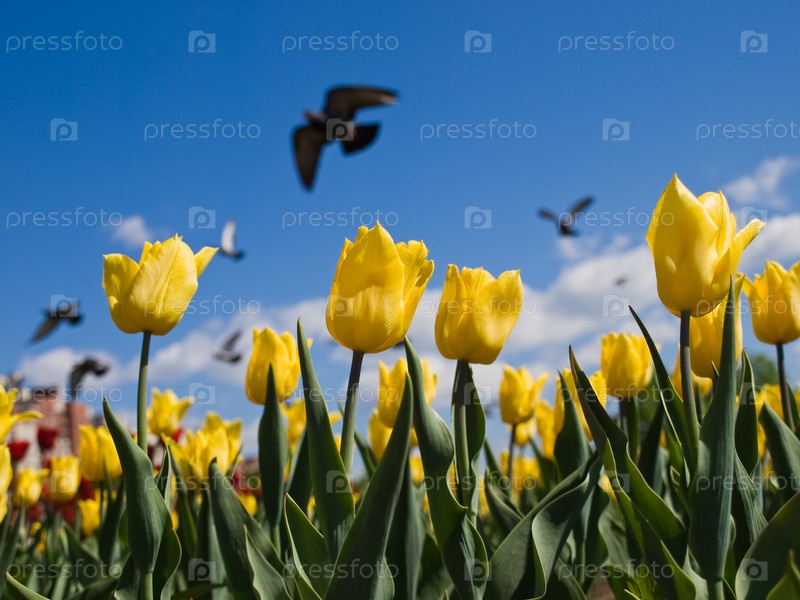 Желтые тюльпаны и летающие голуби на фоне синего неба