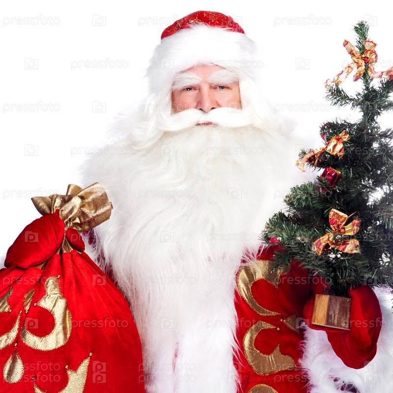 Дед Мороз с мешком подарков и новогодней елочкой в руках на белом фоне