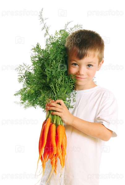 Мальчик со свежей морковкой на белом фоне