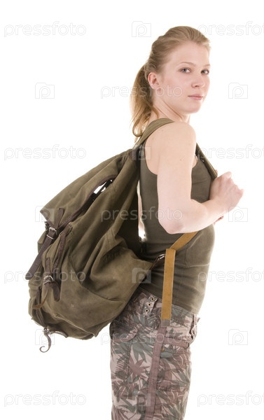 Девушка с рюкзаком на белом фоне