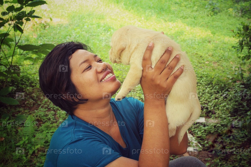 Женщина играет со щенком