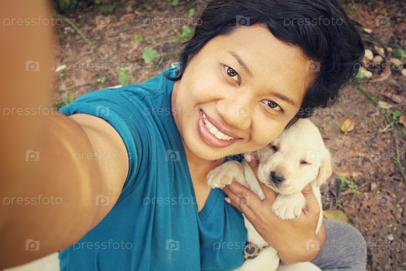 Селфи женщина играет со щенком