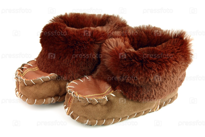Детские меховые ботинки ручной работы на белом фоне