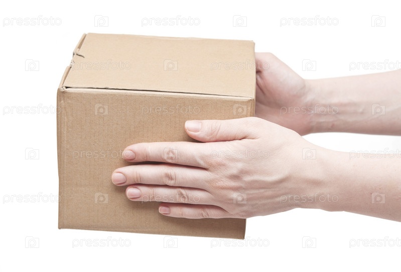 Картонная коробка в руке на белом фоне