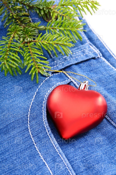 Новогоднее украшение в виде красного сердца с еловой веткой на синих джинсах