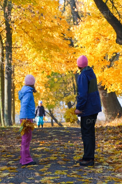 Счастливая семья (мать с маленькими детьми) на прогулке в осеннем парке