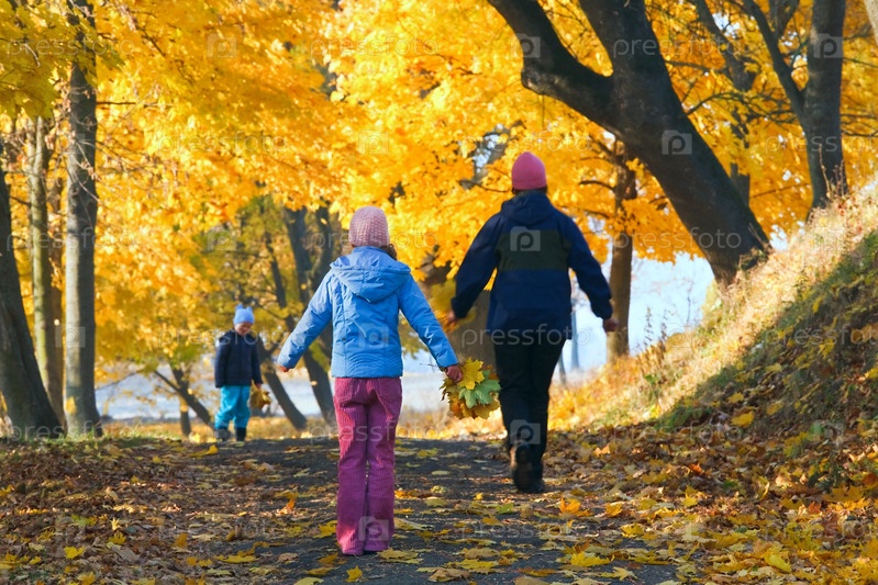 Счастливая семья (мать с маленькими детьми) на прогулке в осеннем парке