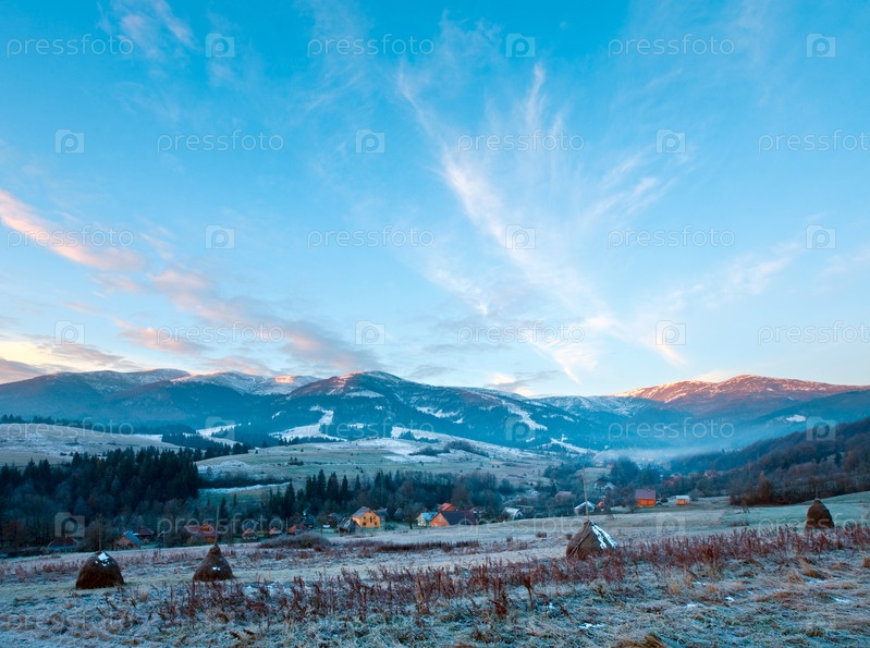 Первые осенние заморозки на пастбище со стогами сена и восход солнца в горах
