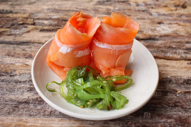 Копченый лосось с салат из морской капусты