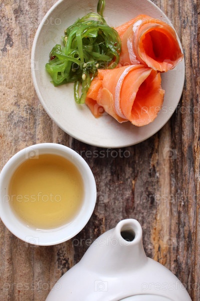 Копченый лосось с салат из водорослей и горячий чай