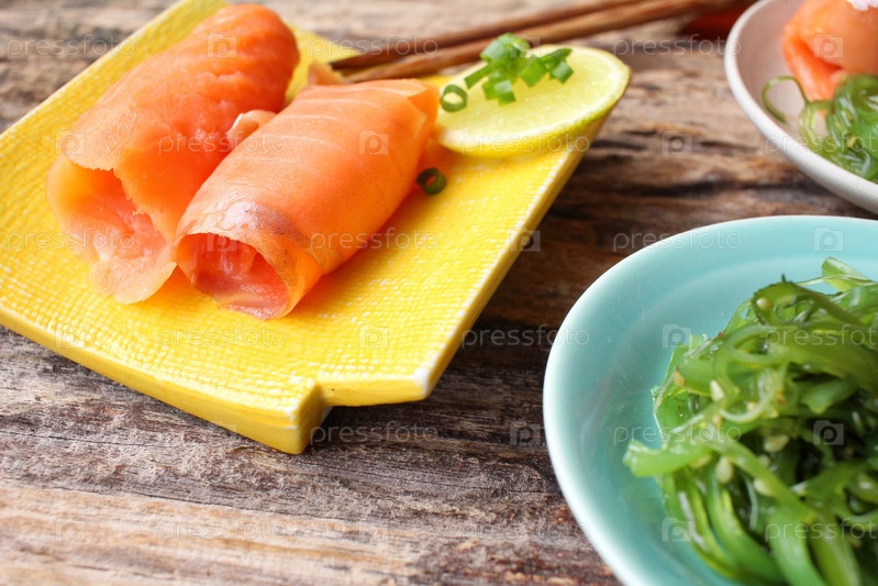 Копченый лосось с салат из морской капусты