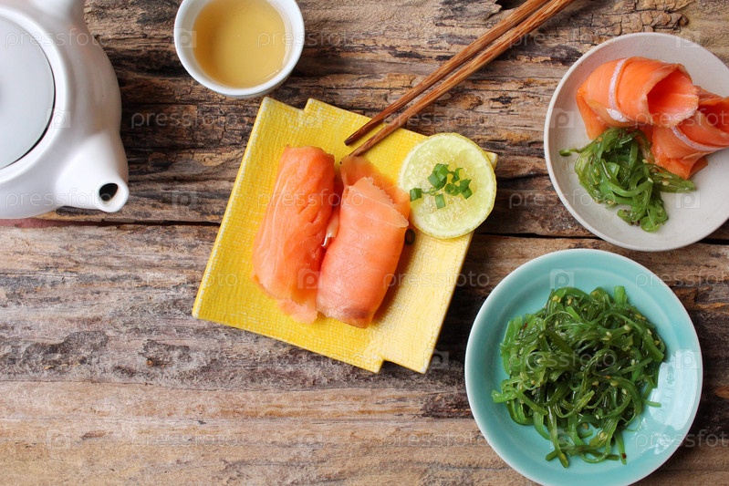 Копченый лосось с салат из водорослей и горячий чай