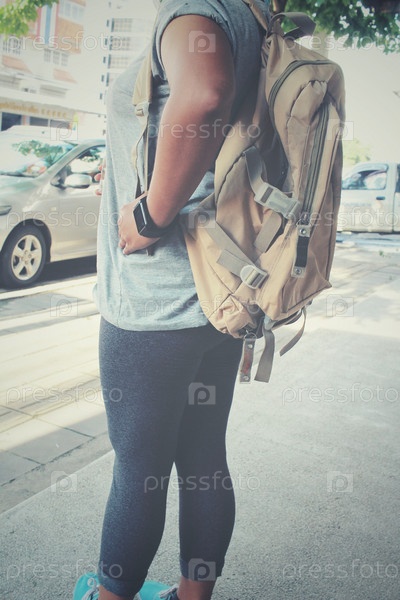 Туристический женщина с рюкзак стоял на дороге