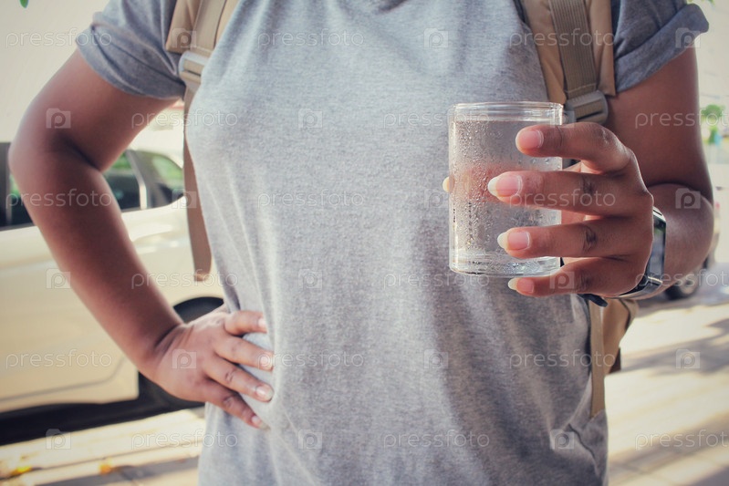 Турист женщина с напиток из воды и рюкзак, стоя на дороге