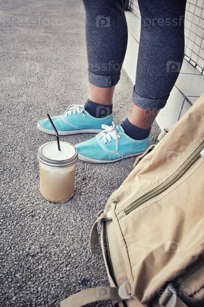 Ноги в бирюзовых кроссовках, стаканчик кофе и рюкзак