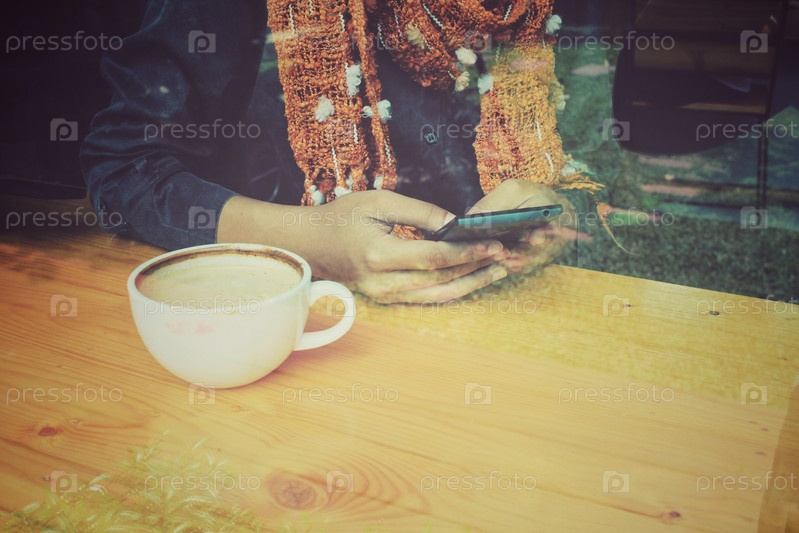 Женщина пить кофе с смартфон