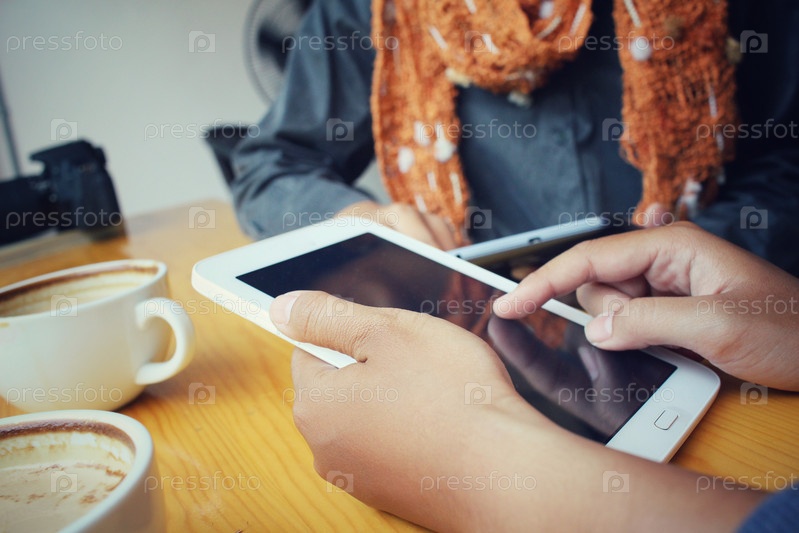 Мужские и женские пара с планшета сидя крытый в модных городских кафе