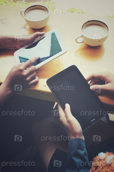 Мужские и женские пара с планшета сидя крытый в модных городских кафе