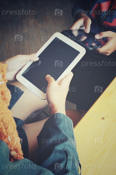 Мужские и женские пара с планшета сидя крытый в модных городских кафе