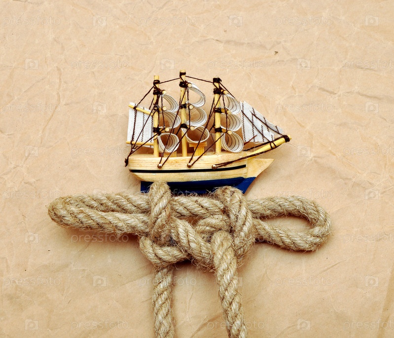 Веревка с узлом и модель парусно-весельного судна на светло-коричневом фоне