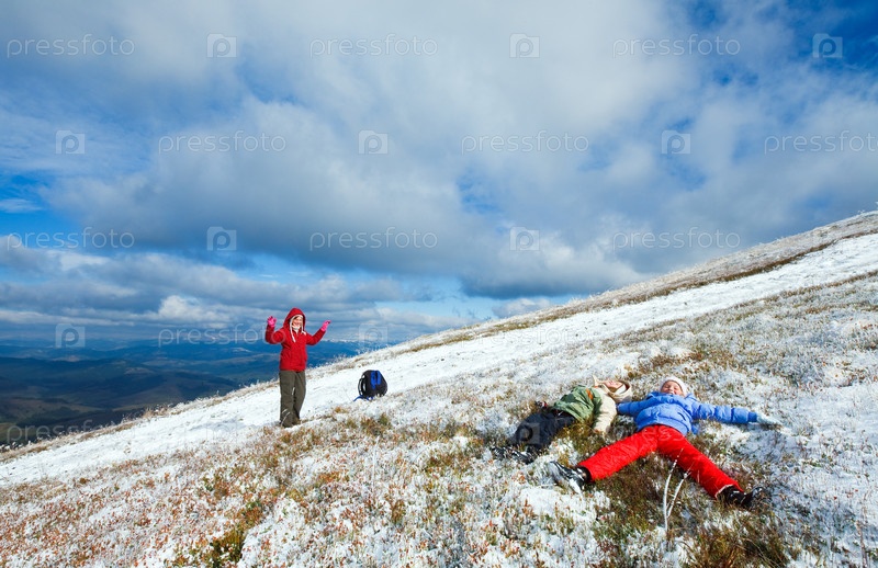 Семья (мать с детьми) в горах с первым снегом