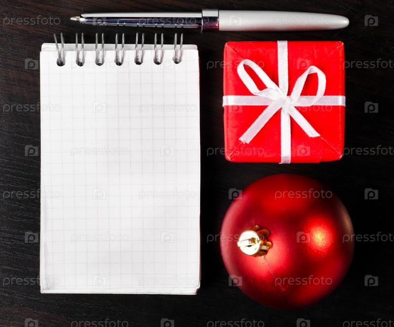 Отрытый блокнот, ручка, подарок и елочный шарик лежат на черном столе