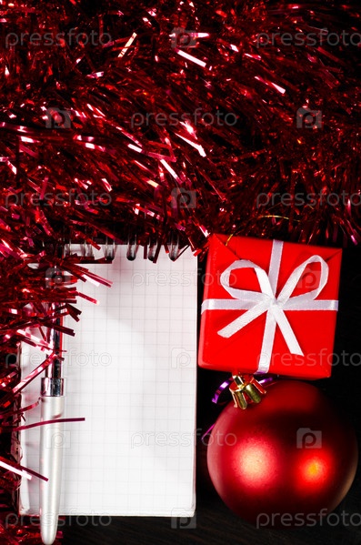 Отрытый блокнот, ручка, подарок и елочные украшения лежат на черном столе