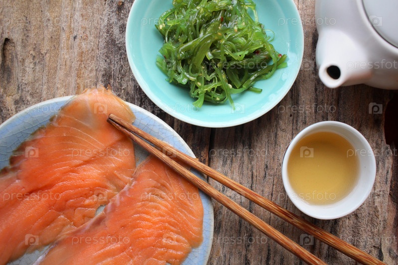 Копченый лосось, салат с горячим чаем