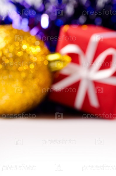 Подарок и елочные украшения лежат на листе бумаги