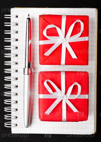 Ручка, подарки и блокнот на черном фоне