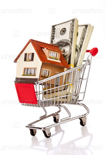 Дом и деньги в корзине для покупок, на белом фоне