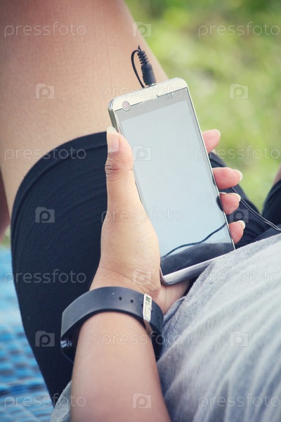 Женщина, прослушивания музыки на наушники с смарт-телефон в саду