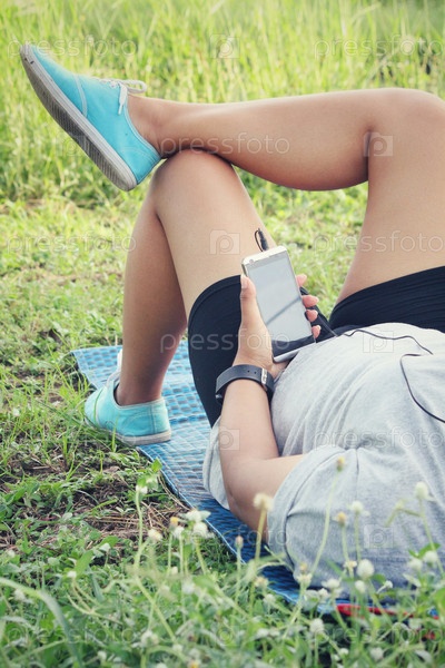 Женщина, прослушивания музыки на наушники с смарт-телефон в саду