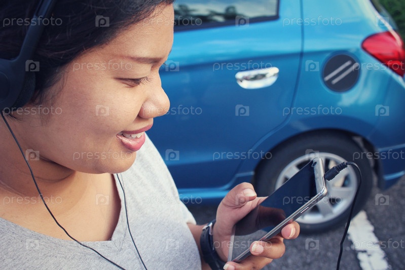 Женщина, прослушивания музыки на наушники с смарт-телефон