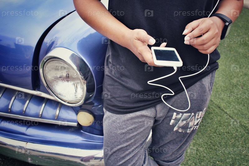 Женщина, прослушивания музыки на наушники с смарт-телефон