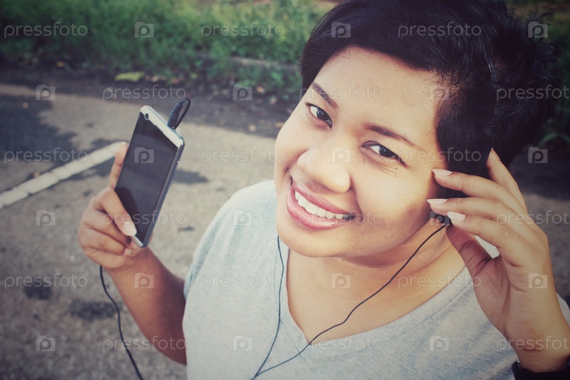 Женщина, прослушивания музыки на наушники с смарт-телефон