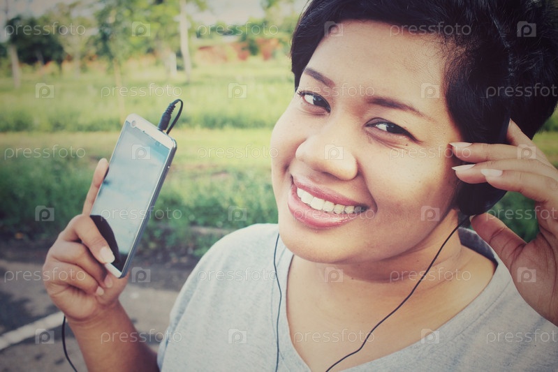 Женщина, прослушивания музыки на наушники с смарт-телефон