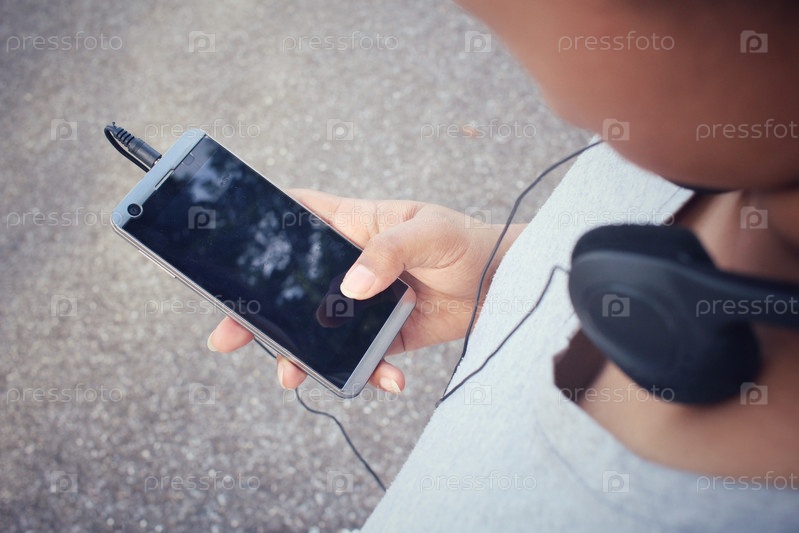 Женщина, прослушивания музыки на наушники с смарт-телефон