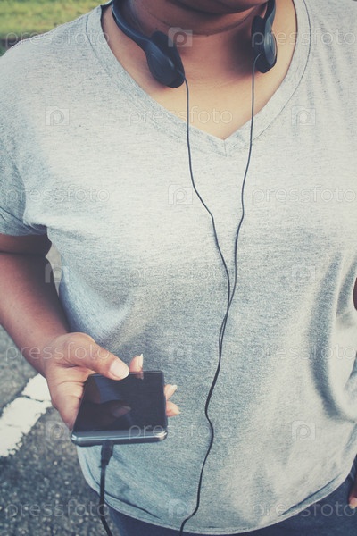 Женщина, прослушивания музыки на наушники с смарт-телефон