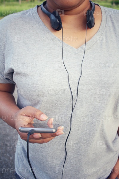 Женщина, прослушивания музыки на наушники с смарт-телефон