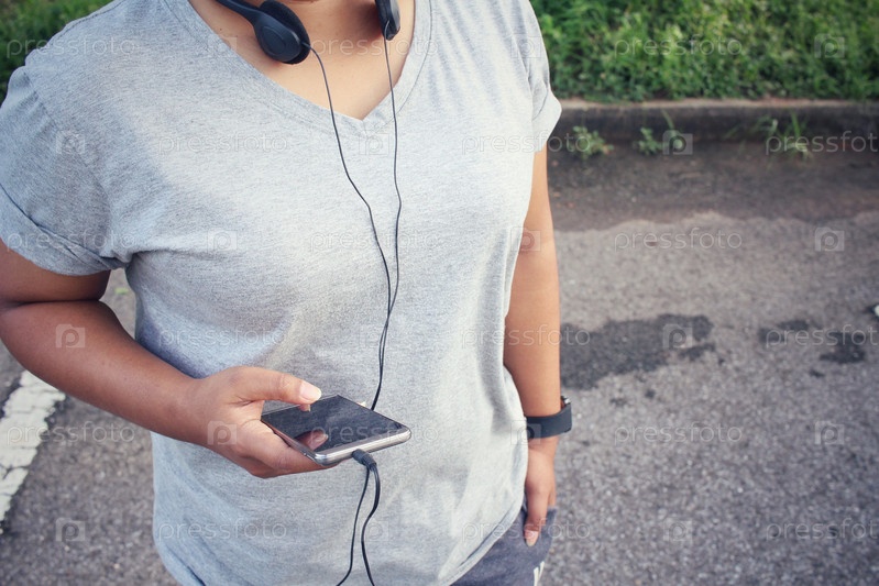 Женщина, прослушивания музыки на наушники с смарт-телефон