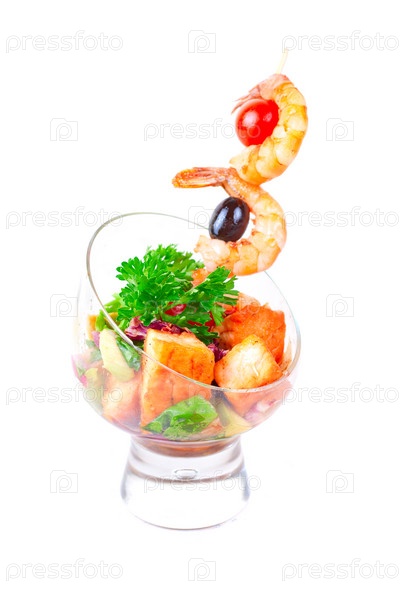 Шашлык из креветок с овощами, зеленью и лососем