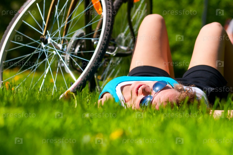 Женщина лежит рядом с велосипедом в парке