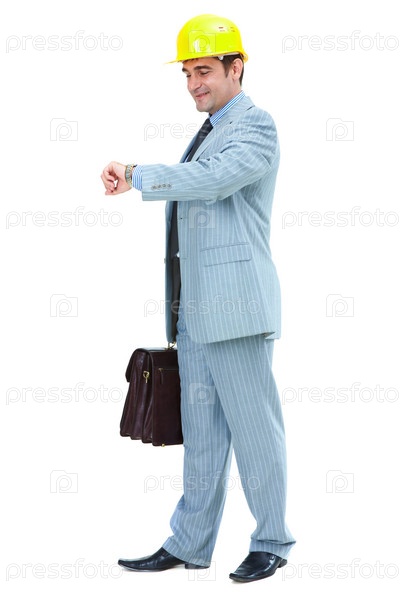 Деловой человек в костюме и строительной каске смотрит на часы