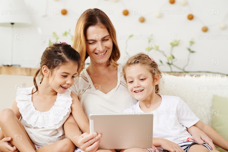 Мать с дочерьми смотрят кино на ноутбуке