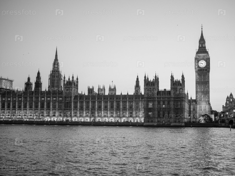 Вестминстерский дворец ночью в Лондоне, Великобритания в черно-белом