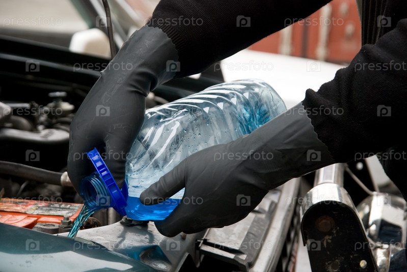 Механик наливает промывочную жидкость в автомобиль