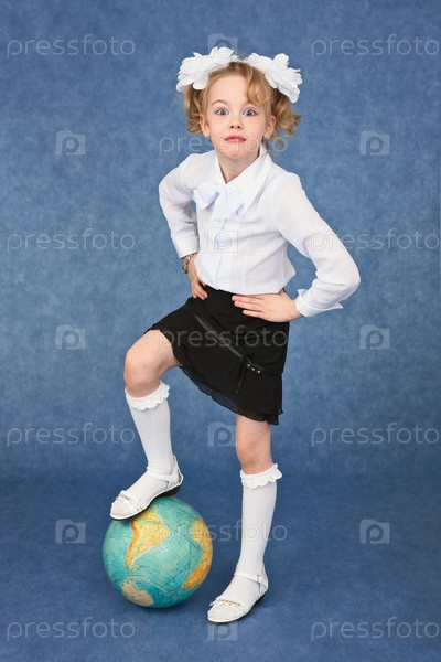 Ученица смотрит на географический глобус на синем фоне